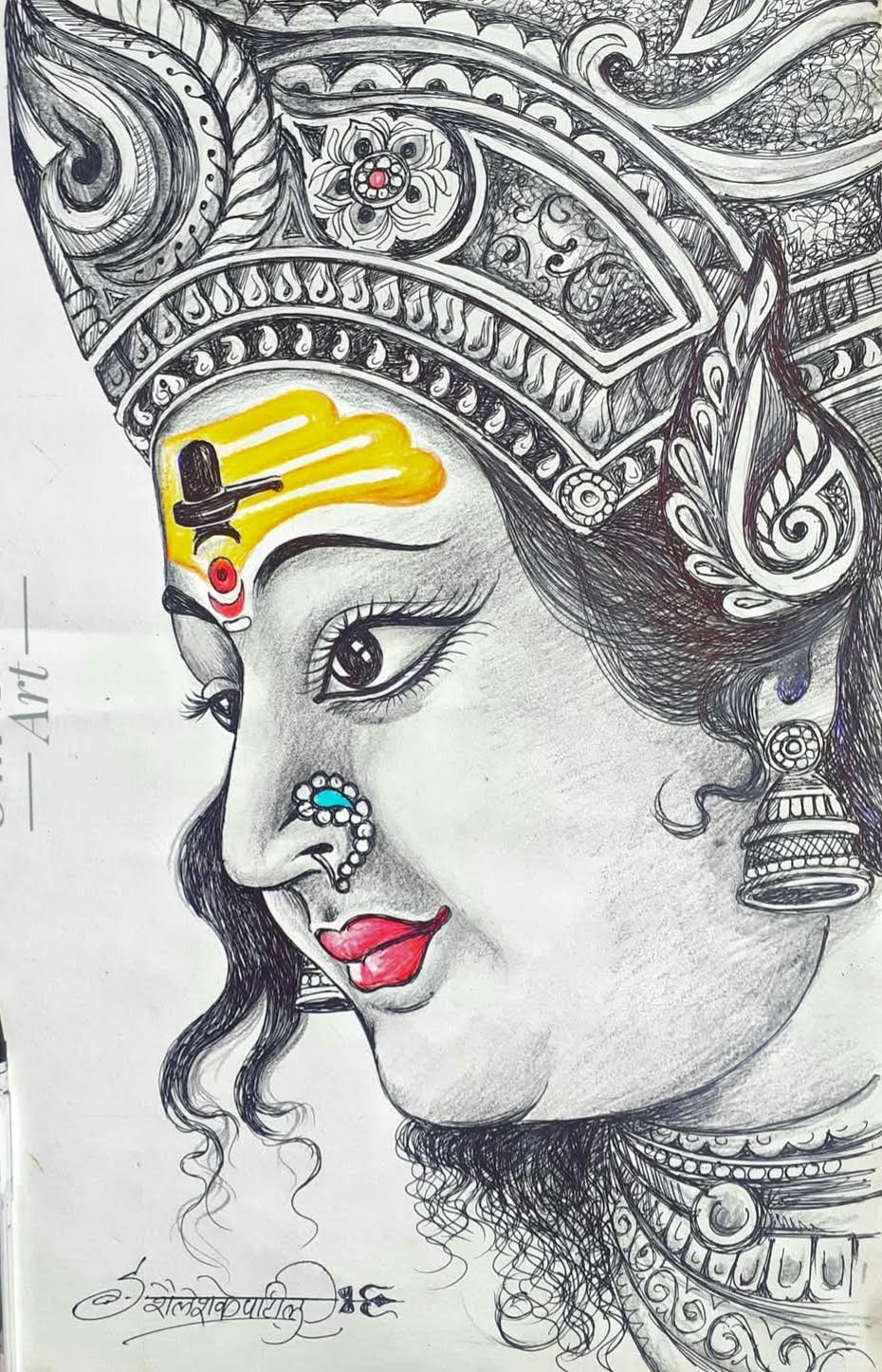 This artwork is not just a portrait; it’s a moment of calm captured in ink. Her eyes speak in silence — of strength without aggression, power without pride, beauty without vanity. It reminds us that grace and divinity often lie in subtlety.