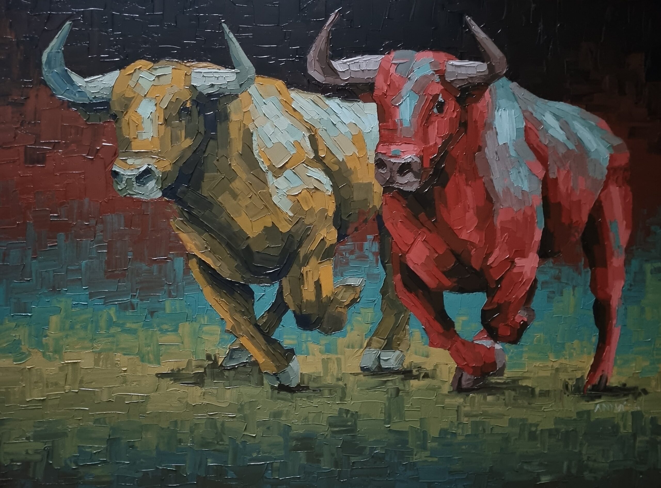 Anna’s work is a celebration of the bull. The form of the bull has always fascinated her with its curious mixture of danger, power, and passivity. Her endeavor is to bring out the sheer masculinity of the bull, its play of muscles and its aggressive and imperious body language, using bold strokes and colors.