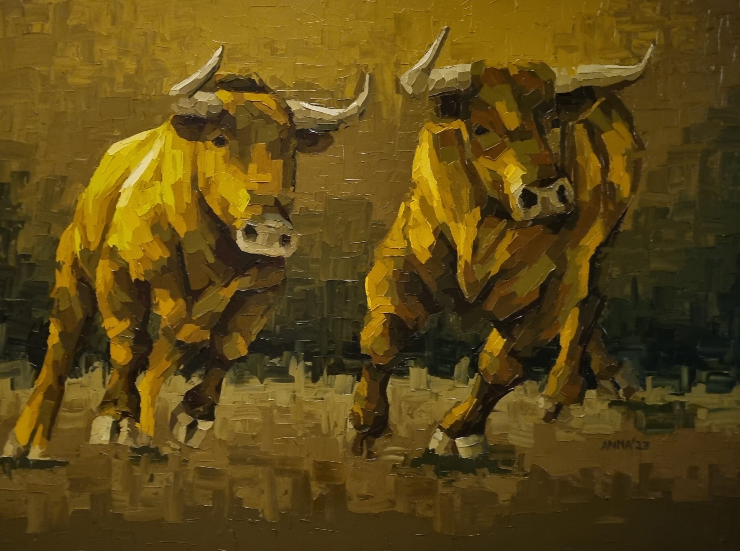 Anna’s work is a celebration of the bull. The form of the bull has always fascinated her with its curious mixture of danger, power, and passivity. Her endeavor is to bring out the sheer masculinity of the bull, its play of muscles and its aggressive and imperious body language, using bold strokes and colors.