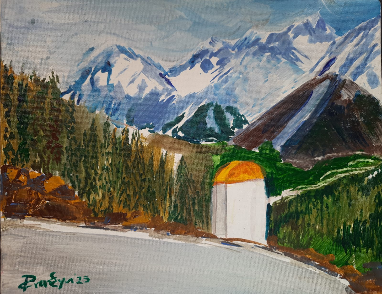 ”Immerse yourself in the serene beauty of the mountains with this stunning landscape painting. Capturing the majestic snow-capped peaks under a soft blue sky, the artwork features lush green forests, rugged terrain, and a quaint white shrine with a saffron dome — symbolizing peace amid nature’s grandeur.