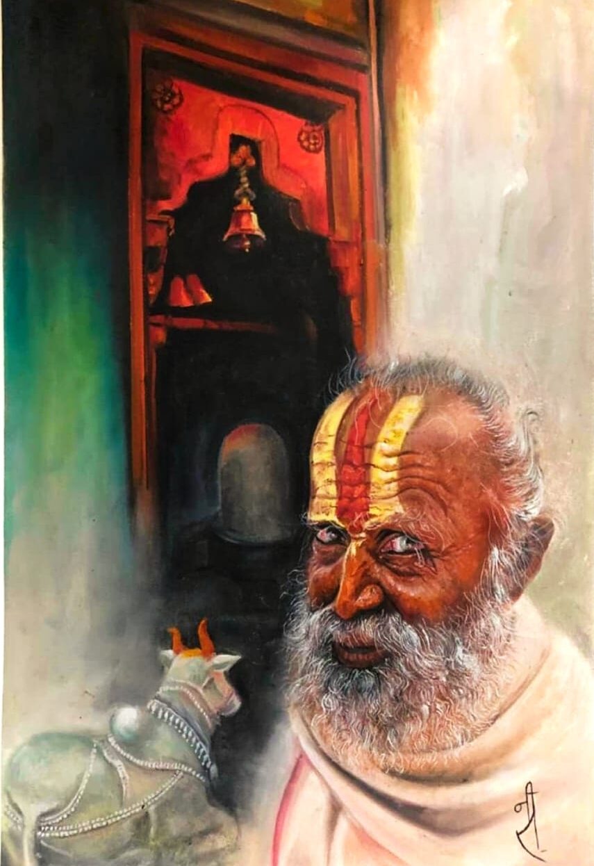 This painting reflects a life steeped in devotion , where time etches wisdom upon the face and faith anchors the soul. In the quite glow of ritual remembrance the divine and the human meet in reverent harmony.
