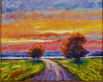 This vibrant landscape painting captures the serenity of a countryside road at sunset. Richly textured with bold brushstrokes, it features a winding path flanked by lush green fields and vivid autumnal trees.