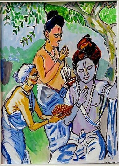 This touching artwork titled Sabri ke Jhute Ber brings to life one of the most heartfelt moments from the Ramayana. Painted in acrylic on canvas, it depicts the humble devotion of Sabri as she offers tasted berries to Lord Rama, ensuring only the sweetest ones reach him. Rama’s gracious acceptance reflects divine love that transcends social status and purity of heart. The earthy tones, expressive strokes, and folk-inspired style add warmth and simplicity to this sacred story