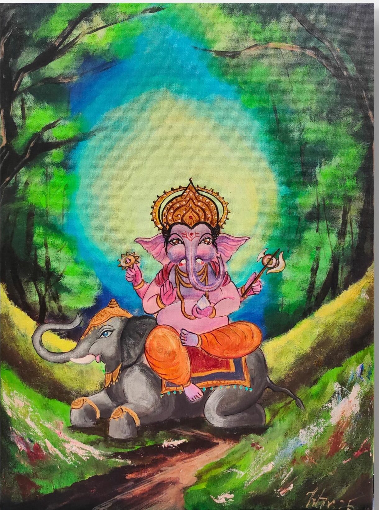 Bring home the blessings of Lord Ganesha, the remover of obstacles and symbol of wisdom, beautifully depicted in this vibrant painting. Seated gracefully on a majestic elephant and surrounded by a serene forest aura, Ganesha radiates peace, strength, and divine energy.